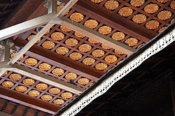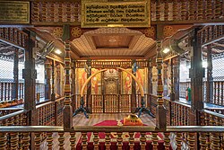 The golden canopy over the main shrine and the golden fence which encircles the temple complex, was built in 1987 by then Prime Minister, Ranasinghe Premadasa.[9] The tooth relic is encased in seven golden caskets which are inlaid with precious gemstones.[10] The casket represent a stupa; the procession casket which is used during the Kandy Esala Perahera is also displayed in the same chamber.
