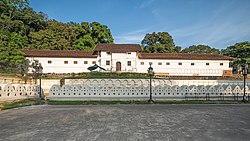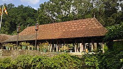 The royal palace is situated to the north of the temple.[11] John Pybus, who was on an embassy in 1762, gives a detailed description of the royal palace.[12] Vikramabahu III of Gampola (r. 1356–1374) and Sena Sammatha Wickramabahu of Kandy (r. 1469–1511) built royal palaces on this site. Vimaladharmasuriya I of Kandy undertook various decorations to the palace. The Dutch orientalist Philippus Baldaeus visited the palace with General Gerard Pietersz Hulft in 1656. The royal residence was known as “Maha Wasala” in Sinhalese starting in the Polonnaruwa period. The royal palace is also known as “Maligawa”[b] (Palace). There were three Wahalkadas and an 8 feet (2.4 m) high wall used as main entrances. The section of the palace facing the Natha Devale is said to be the oldest. During the beginning of the British period, it was used by the government agent Sir John D’Oyly, 1st Baronet, of Kandy.[11] Successors of D’Oyly have continued to use it as their official residence. Today it is preserved as an archaeological museum. Ulpen Ge and Queens Palace are the associated buildings of the palace.