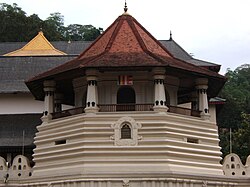 Sri Dalada Maligawa[a], commonly known in English as the Temple of the Sacred Tooth Relic, is a Buddhist temple in Kandy, Sri Lanka. It is located in the Royal Palace Complex of the former Kingdom of Kandy, which houses the relic of the tooth of the Buddha. Since ancient times, the relic has played an important role in local politics because it is believed that whoever holds the relic holds the governance of the country. The relic was historically held by Sinhalese kings. The Temple of the Tooth is a World Heritage Site mainly due to the temple and the relic.