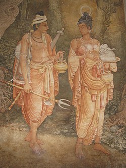 After the Maha parinirvana of Gautama Buddha, according to the legend, the tooth relic was preserved in Kalinga. When kingdom Kalinga was attacked, brought to the island by Princess Hemamali and her brother, Prince Dantha on the instructions of their father King Guhasiva. Hemmamali hid the relic in her hair on the way to the island. They landed on the island in Lankapattana during the reign of Sirimeghavanna of Anuradhapura (301–328) and handed over the tooth relic. The king enshrined it in Meghagiri Vihara (present day Isurumuniya) in Anuradhapura. Safeguarding the relic was the responsibility of the monarch from then, therefore over the years, the custodianship of the relic came to symbolize the right to rule the island. Therefore, reigning monarchs built the tooth relic temples quite close to their royal residences, as was the case during the times of the Anuradhapura Kingdom, Kingdom of Polonnaruwa, and Kingdom of Dambadeniya. During the era of the Kingdom of Gampola, the relic was housed in Niyamgampaya Vihara. It is reported in the messenger poems such as Hamsa, Gira, and Selalihini that the temple of tooth relic was situated within the city of Sri Jayawardenepura Kotte when the Kingdom of Kotte was established there.[1][2]